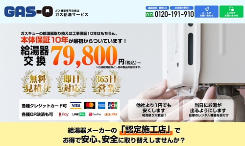 ガス給湯サービス GAS-Qは嶺岡設備株式会社が運営する給湯器の交換や修理を専門とする業者です。大阪府・京都府・兵庫県・奈良県に密着したサービスを展開しており、最短即日でお湯が出るようにしてくれるのが大きな特徴です。